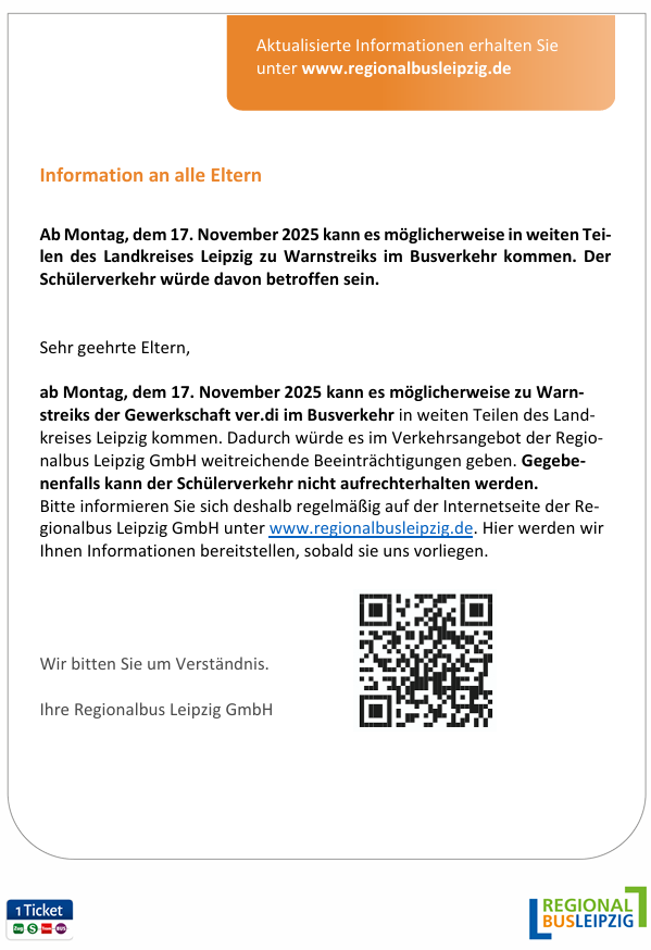 In den Morgenstunden kann es in den ersten Tagen nach dem 03.11.2025 vor allem zwischen Machern und Brandis aufgrund geänderter Fahrtzeiten und geänderter Haltestellen zu anfänglichen Problemen hinsichtlich der Verteilung der Schüler auf die einzelnen Busse kommen.